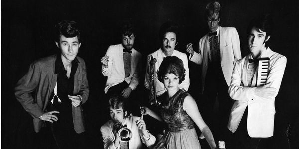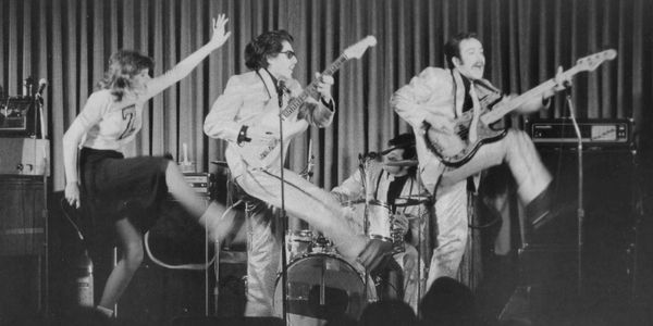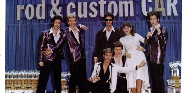 Here the band sports 1950's tuxedos in a professional photo shoot. Nice greaser wigs, in response to agents pleas to "Cut your hair!".